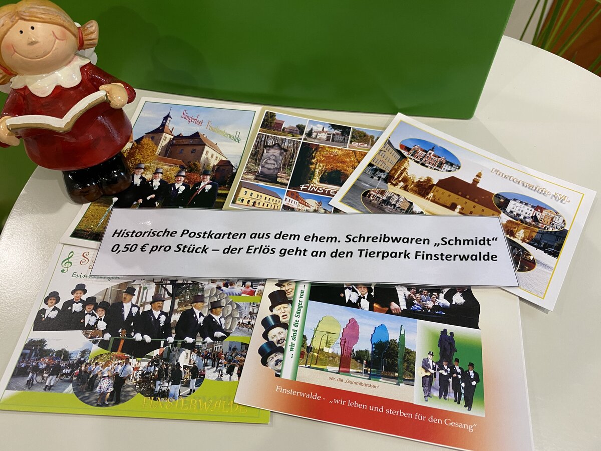 Eine besondere Neuheit sind außerdem Postkarten aus dem Bestand des ehemaligen Schreibwarenladens Schmidt in der Berliner Straße. Der Erlös aus dem Verkauf dieser Karten kommt dem Finsterwalder Tierpark zugute und verbindet damit Geschenkfreude mit einem guten Zweck.